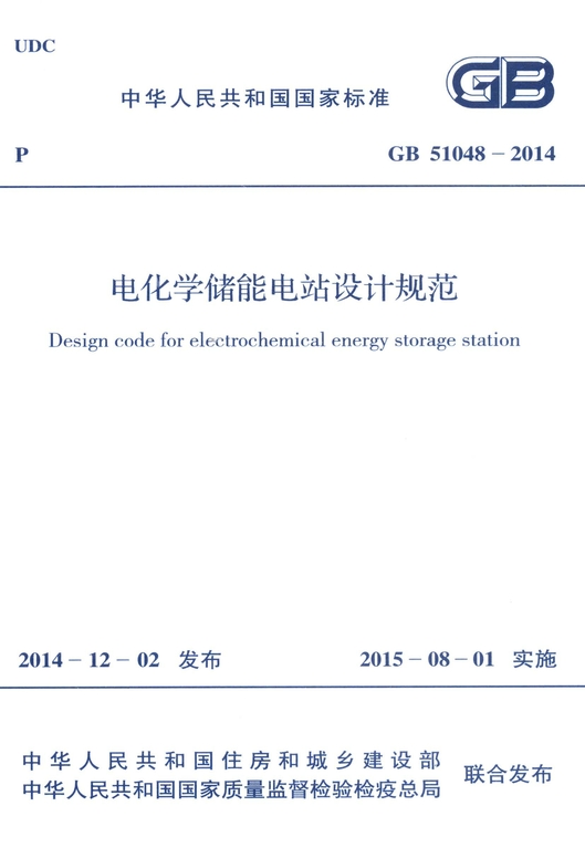 现批准《电化学储能电站设计规范》为国家标准,编号为GB 51048—2014,自2015年8月1日起实施。其中,第4.0.3、11.1.3、11.2.4、11.4.2条为强制性条文,必须严格执行。