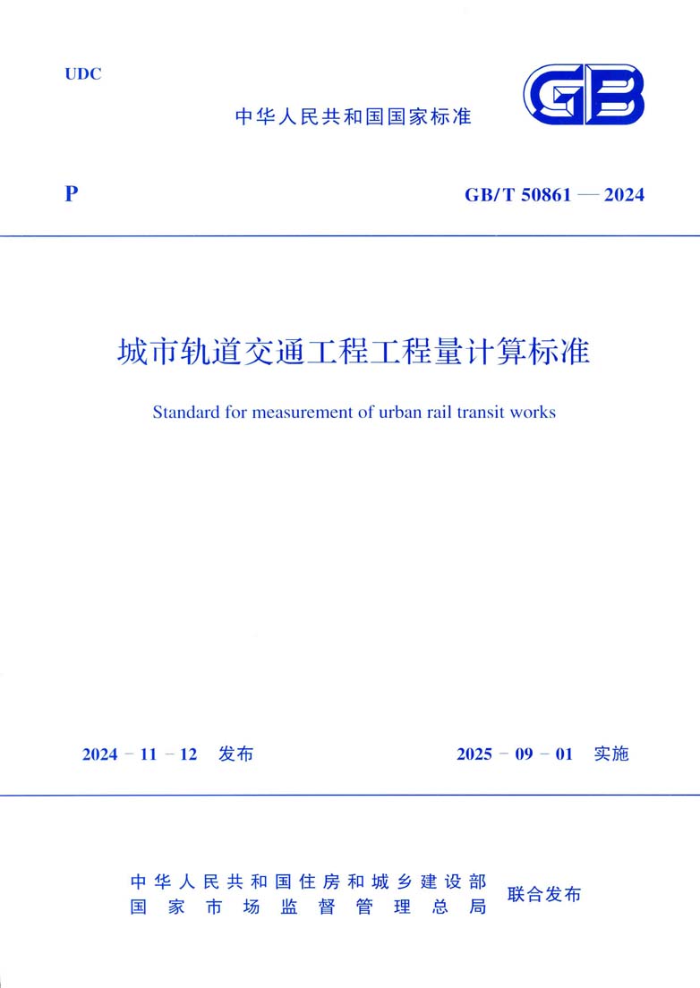 现批准《城市轨道交通工程工程量计算标准》为国家标准,编号为GB/T50861—2024,自2025年9月1日起实施。原国家标准《城市轨道交通工程工程量计算规范》(GB 50861—2013)同时废止。