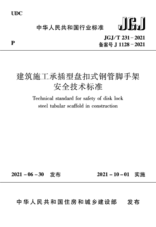 现批准《建筑施工承插型盘扣式钢管脚手架安全技术标准》为行业标准,编号为JGJ/T 231--2021,自2021年10月1日起实施。原行业标准《建筑施工承插型盘扣式钢管支架安全技术规程》JGJ 231--2010同时废止。本标准在住房和城乡建设部门户网站(www.mohurd.gov.cn)公开,并由住房和城乡建设部标准定额研究所组织中国建筑出版传媒有限公司出版发行。