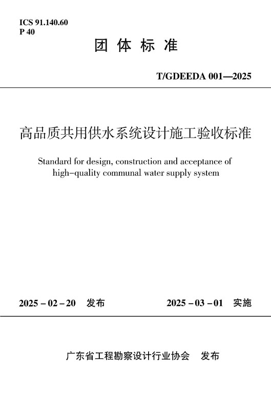 为促进我省工程勘察设计行业技术进步和创新发展,从2025年1月1日起协会团体标准的社会团体代号更改为协会的英文缩写“GDEEDA”。现批准《高品质共用供水系统设计施工验收标准》(编号为T/GDEEDA 001-2025)为广东省工程勘察设计行业协会团体标准,自2025年3月1日起施行。