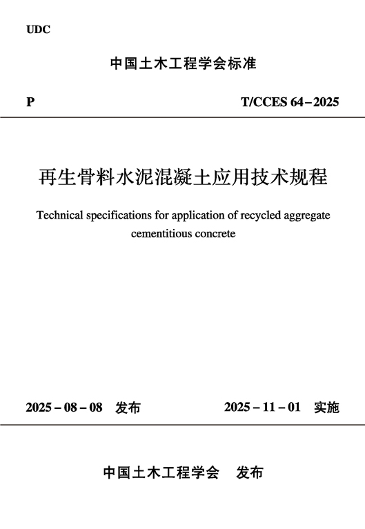 现批准《再生骨料水泥混凝土应用技术规程》为学会标准,编号为T/CCES 64-2025,自2025年11月1日起实施。