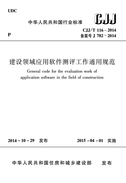 现批准《建设领域应用软件测评工作通用规范》为行业标准,编号为CJJ/T 116-2014,自2015年4月1日起实施。原行业标准《建设领域应用软件测评通用规范》CJJ/T 116-2008同时废止。