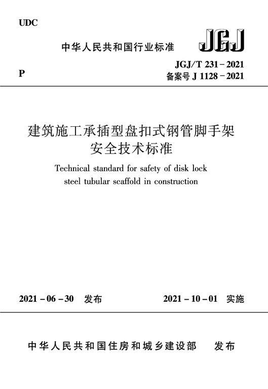 现批准《建筑施工承插型盘扣式钢管脚手架安全技术标准》为行业标准,编号为JGJ/T 231--2021,自2021年10月1日起实施。原行业标准《建筑施工承插型盘扣式钢管支架安全技术规程》JGJ 231--2010同时废止。本标准在住房和城乡建设部门户网站(www.mohurd.gov.cn)公开,并由住房和城乡建设部标准定额研究所组织中国建筑出版传媒有限公司出版发行。